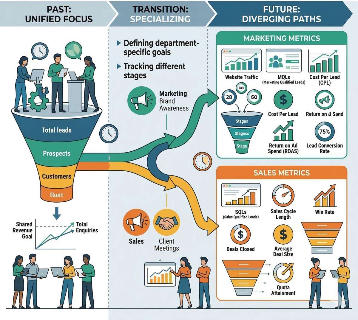 Marketing and sales teams once relied on the same measurement systems. Early customer relationship management tools tracked deals, revenue amounts, and close dates. These measures helped teams understand how work moved through the sales process and how results are tied to revenue goals.